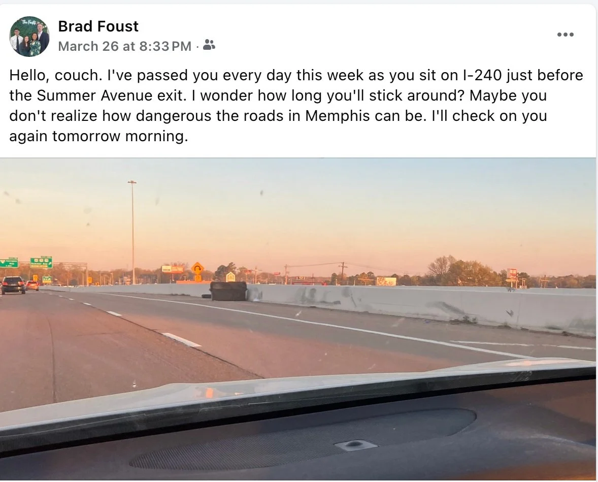 While driving to work a few weeks ago, I was surprised to see an incongruous item sitting on the side of the road. It was located near an exit on I-240, a busy interstate looping around Memphis. I’ve been driving this same route for over 10 years, and as such, I see all sorts of things sitting on the side of the road: tires, mattresses, broken down or burned-out cars, etc. However, this item was different. It was a full-size couch.